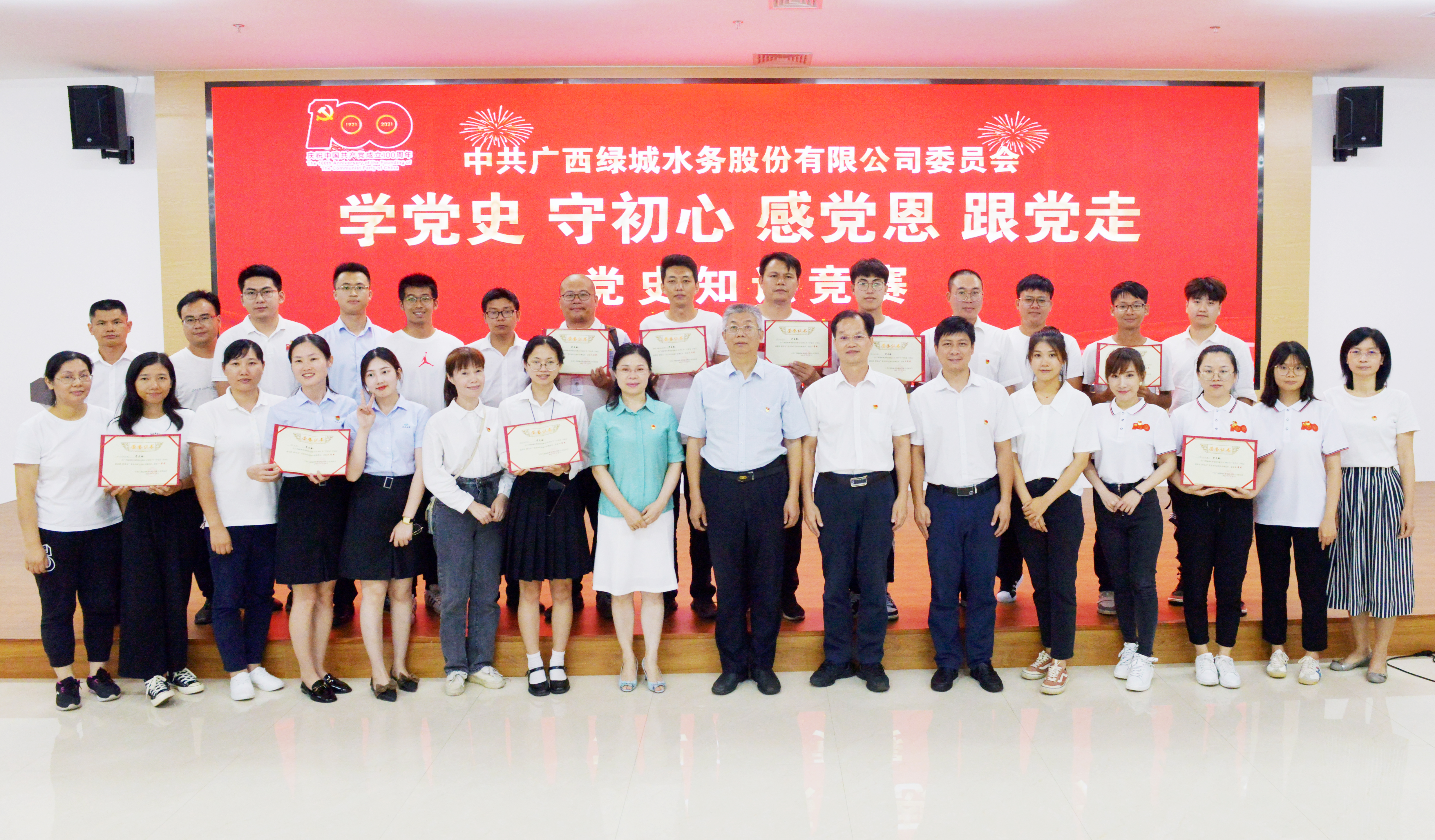 6月25日,廣西綠城水務股份有限公司黨委舉辦“學黨史 守初心 感黨恩 跟黨走”黨史知識競賽,以賽促學,通過競賽帶動廣大黨員干部員工沉下心來學、聯系實際學,推動黨史學習教育入腦入心。集團公司黨委副書記、工會主席陳春麗出席活動并講話,股份公司黨委副書記、總經理徐斌元,股份公司黨委副書記、監事會主席嚴紅兵,股份公司紀委書記何華麗出席活動,集團公司黨委辦公室副主任黃漢宜應邀參加指導競賽活動。