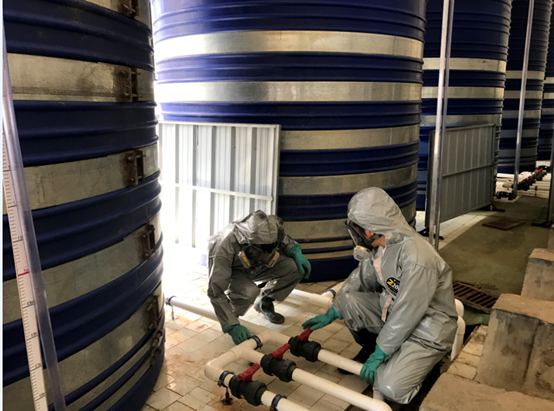 ▲水廠開展防次氯酸鈉泄漏應急演練現場。