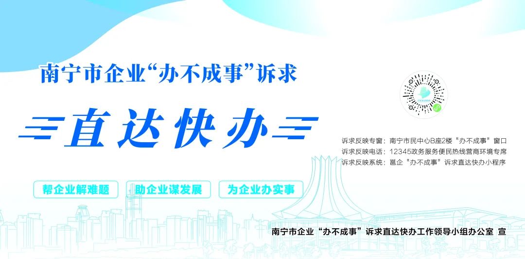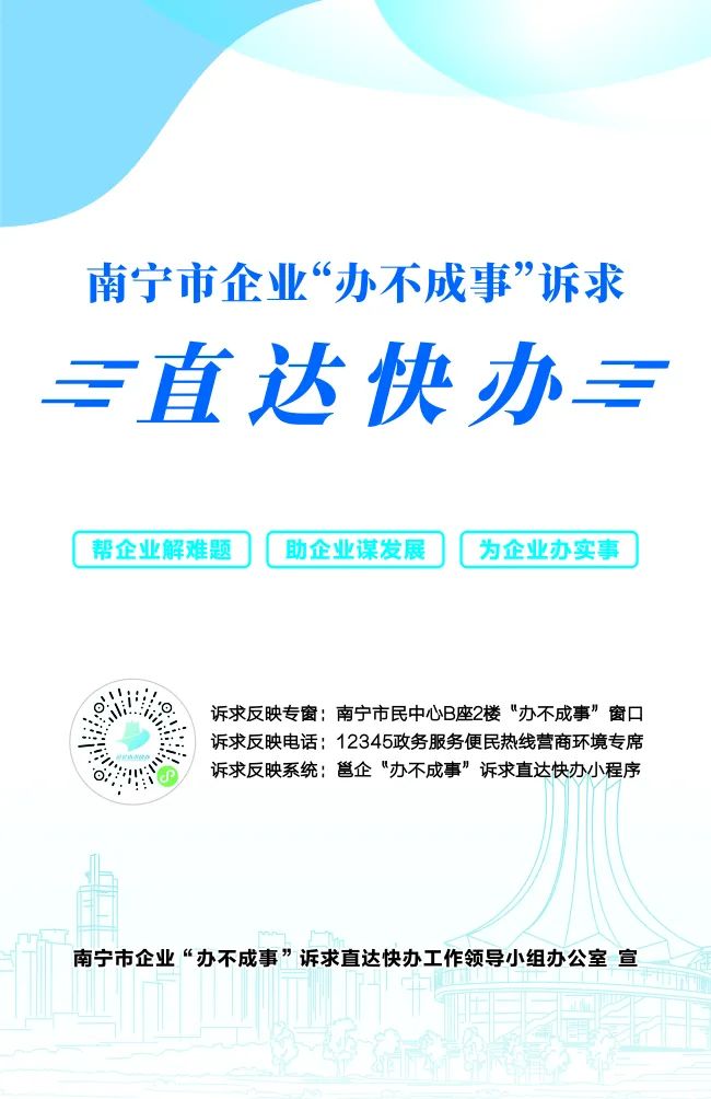 為貫徹落實中央、自治區經濟工作會議精神,優化首府營商環境,南寧市建立企業“辦不成事”訴求直達快辦工作機制,依托南寧市民中心“辦不成事”訴求窗口、12345優化營商環境專線、“邕企辦不成事訴求快辦”小程序收集企業訴求,暢通訴求反映渠道,整合紀檢監察監督、行政監督、司法監督力量推動責任落實,構建訴求受理、快速響應、高效辦理、答復反饋、跟蹤督辦、改進提升的全過程閉環管理體系,幫助企業破除“辦不成事”的難點、堵點、痛點、瘀點,及時解決企業經營發展難題、積極回應關心關切、幫助企業提振信心,切實為企業解難題、辦實事,為建設面向東盟開放合作的國際化大都市開好局起好步提供有力支撐。